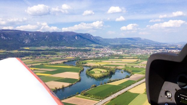 Takeoff in Grenchen, Bielersee, Neuchatel, Creux du Van, Fribourg, Grenchen.